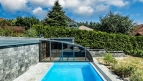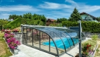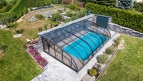 Since the garden is on a slope, Mr. K. chose the DALLAS ON THE WALL type of enclosure, which suits the irregular surrounding terrain perfectly and allows swimming even under cover. In addition, it provides enough space to sit with friends and even provides the possibility of using the pool during bad weather.