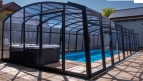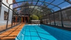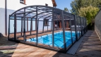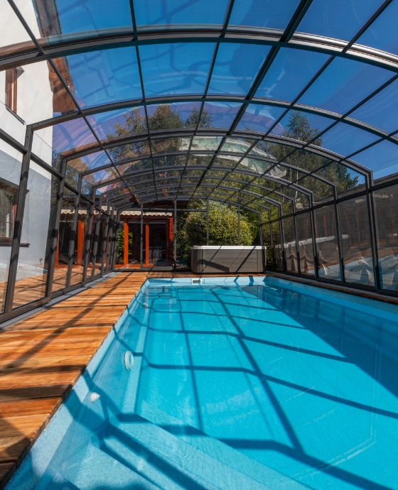 Ultimately, they chose a custom-made high walk-in CASABLANCA enclosure, which not only covers their pool but also provides space for a hot tub and lounge chair underneath. Thanks to its height, they can move around freely without bending, and the pool remains accessible from both sides. Combined with a heat pump, the enclosure allows them to enjoy their pool for up to seven months a year.