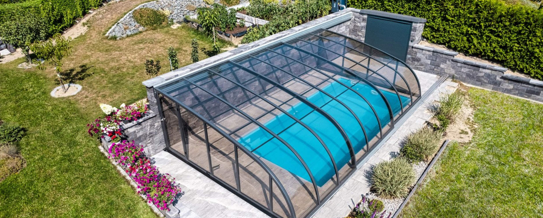 What's the best way to cover a pool that's located close to your house wall? The solution is a custom-made DALLAS on the wall, which offers you an unexpected amount of space on a small surface.